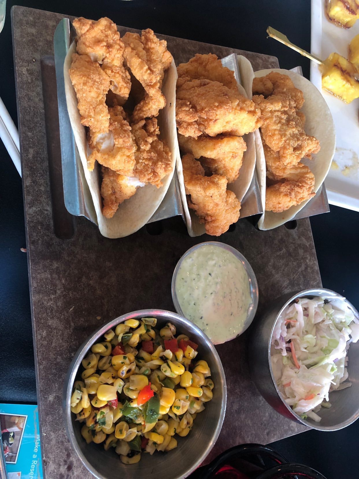 And the Baja Fish Tacos With battered white fish, flour tortillas, cabbage slaw, corn salsa and cilantro lime crema.