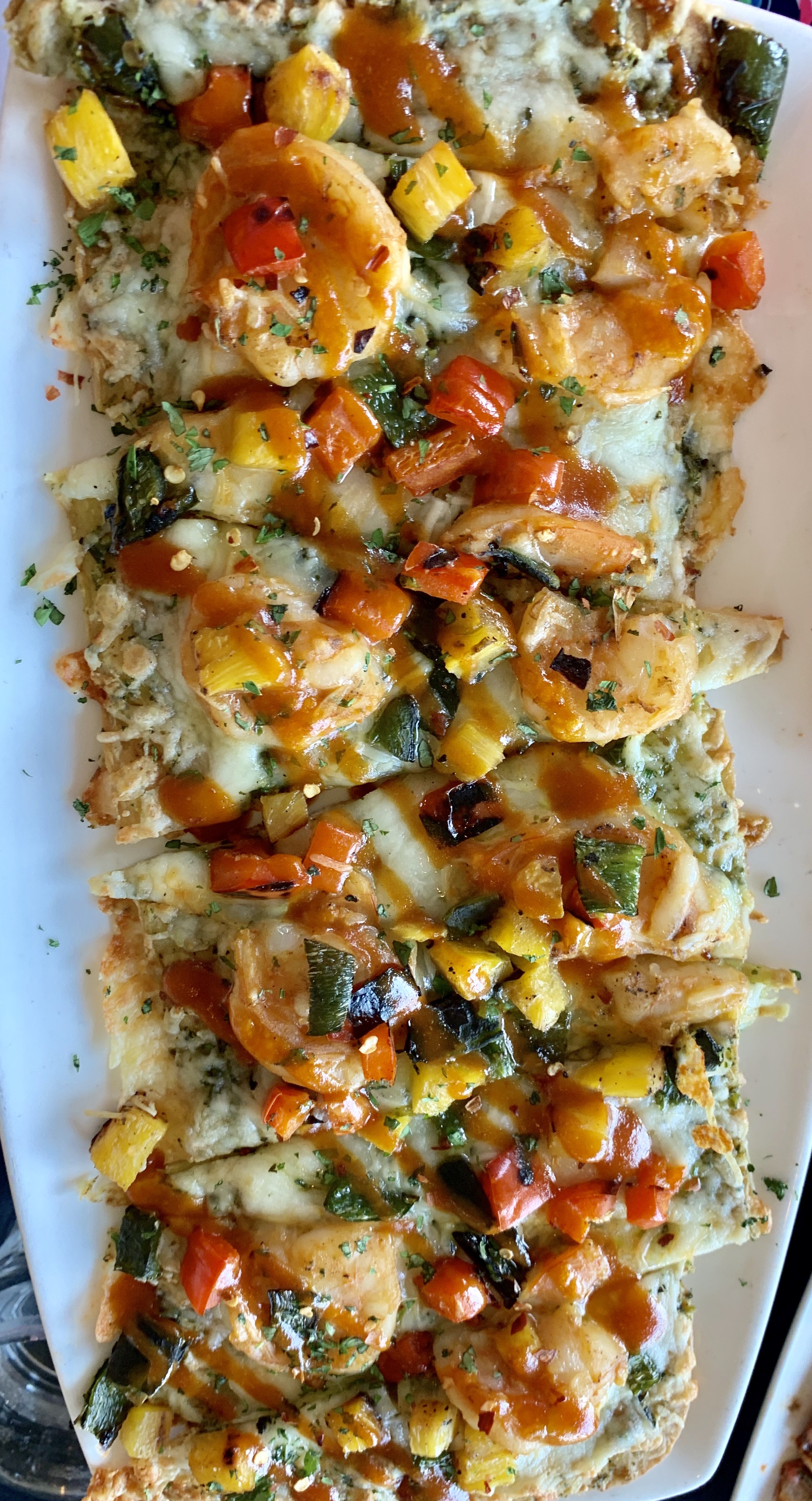 Then we sampled the Shrimp & Pineapple flatbread with grilled pineapple, poblano, red pepper, P37 cheese, and BBQ shrimp. This was another solid favorite for me. The barbecue sauce is sweet and tangy, the peppers give it a little heat and kick, and the flatbread is super crispy.